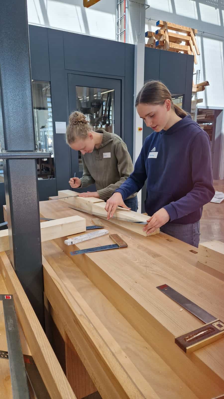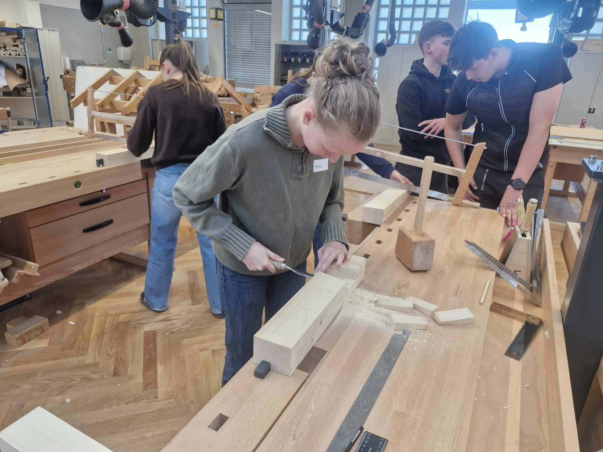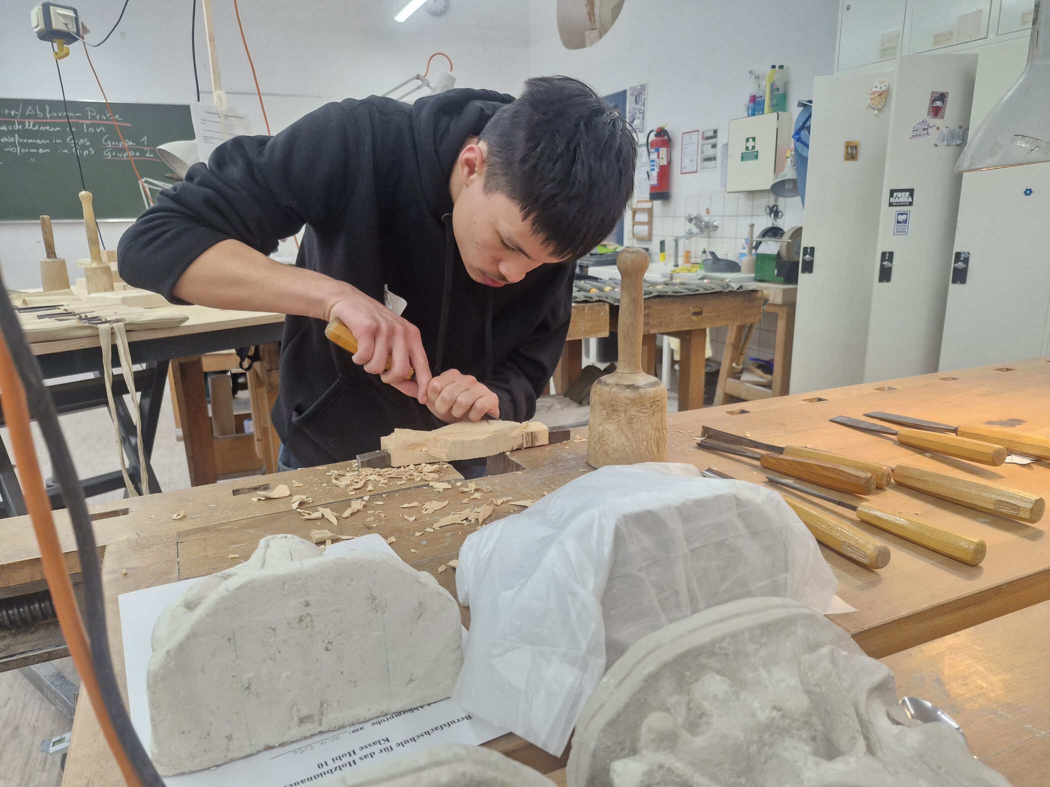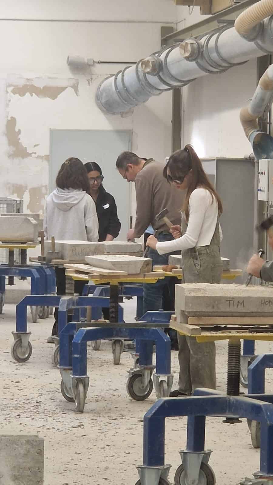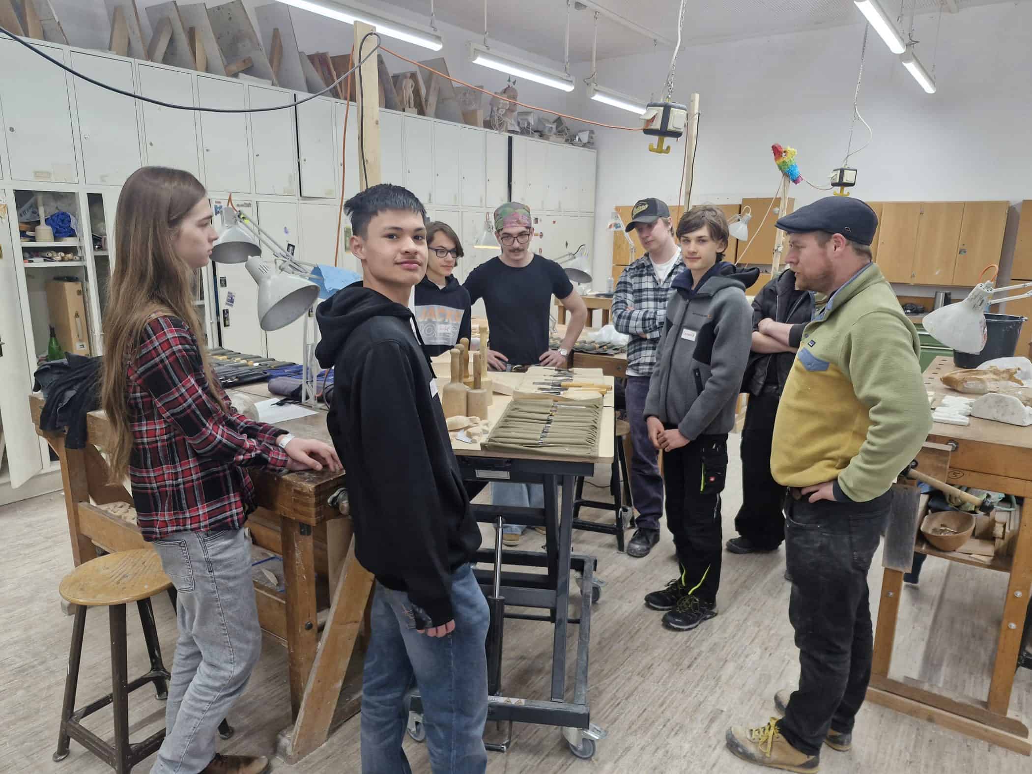 Nach einer kurzen Vorstellungsrunde konnten die Jugendlichen unter Anleitung unserer Auszubildenden sowie Lehrerinnen und Lehrer selbst praktisch in den Werkstätten arbeiten und erste Einblicke in das Steinmetz-, Holzbildhauer oder Zimmererhandwerk gewinnen.